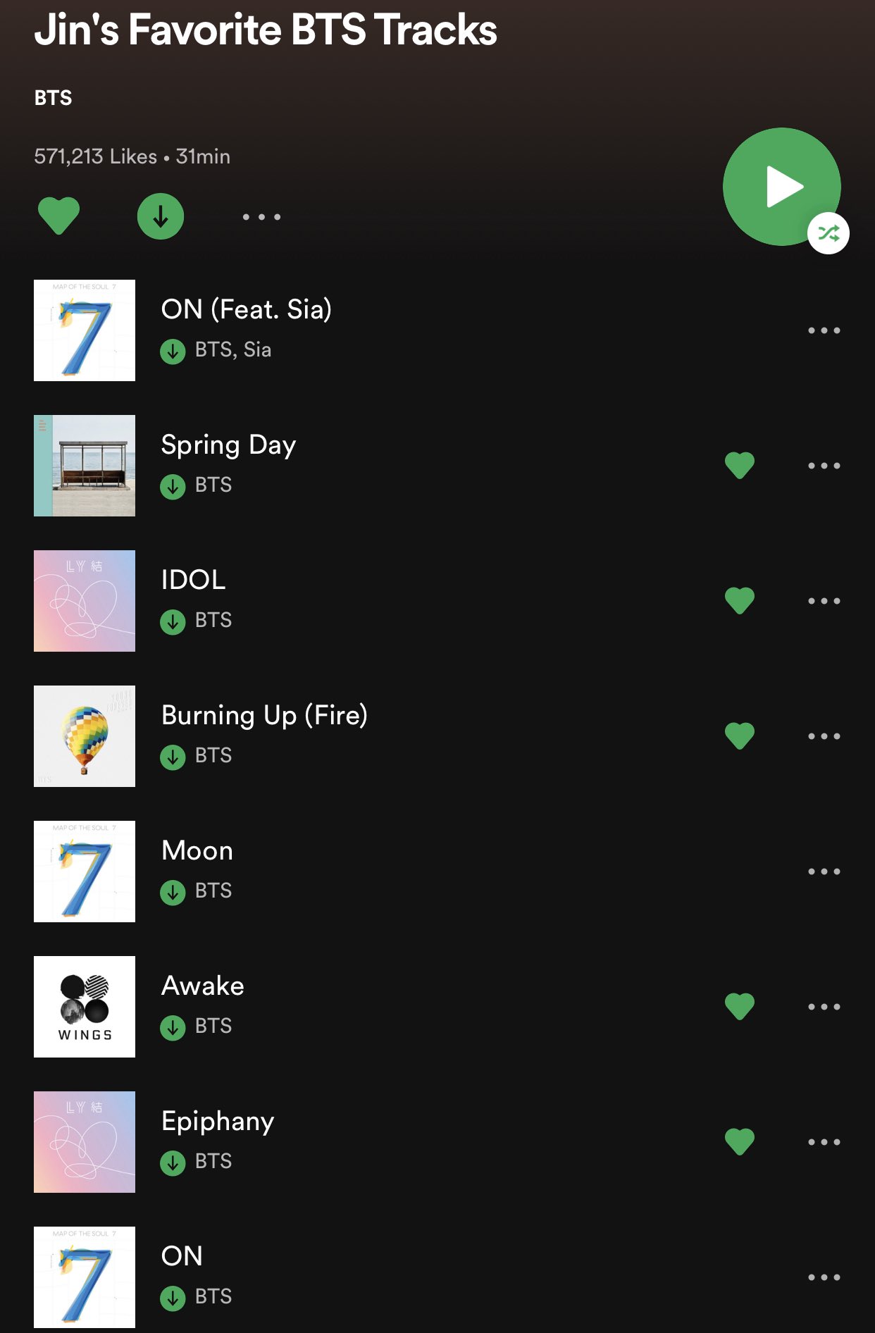 Updated their spotify playlists with their current favorite songs. Within the jin's favorite songs we can also find artists r&b and pop . With just 3 songs, jin has over 325 million streams on spotify. Jin's favourite tracks on spotify · 1. Jin included tracks that have a special place in fans hearts such as spring day and epiphany. Follow 'jin's ga chi deul eul lae?' now~ (gachi deuleulae? His favorite foods are lobster, meat, naengmyeon(korean noodle dish), . Join the party via spotify or apple music here. As a lover of popular music, jin includes current radio hits like . 今天整理了,防弹成员们在《life goes on》和2020 8月份(时期),听的音乐。 jin's favorite tracks. Jin likes the rock and shows it with this song, 'iris' from the goo.