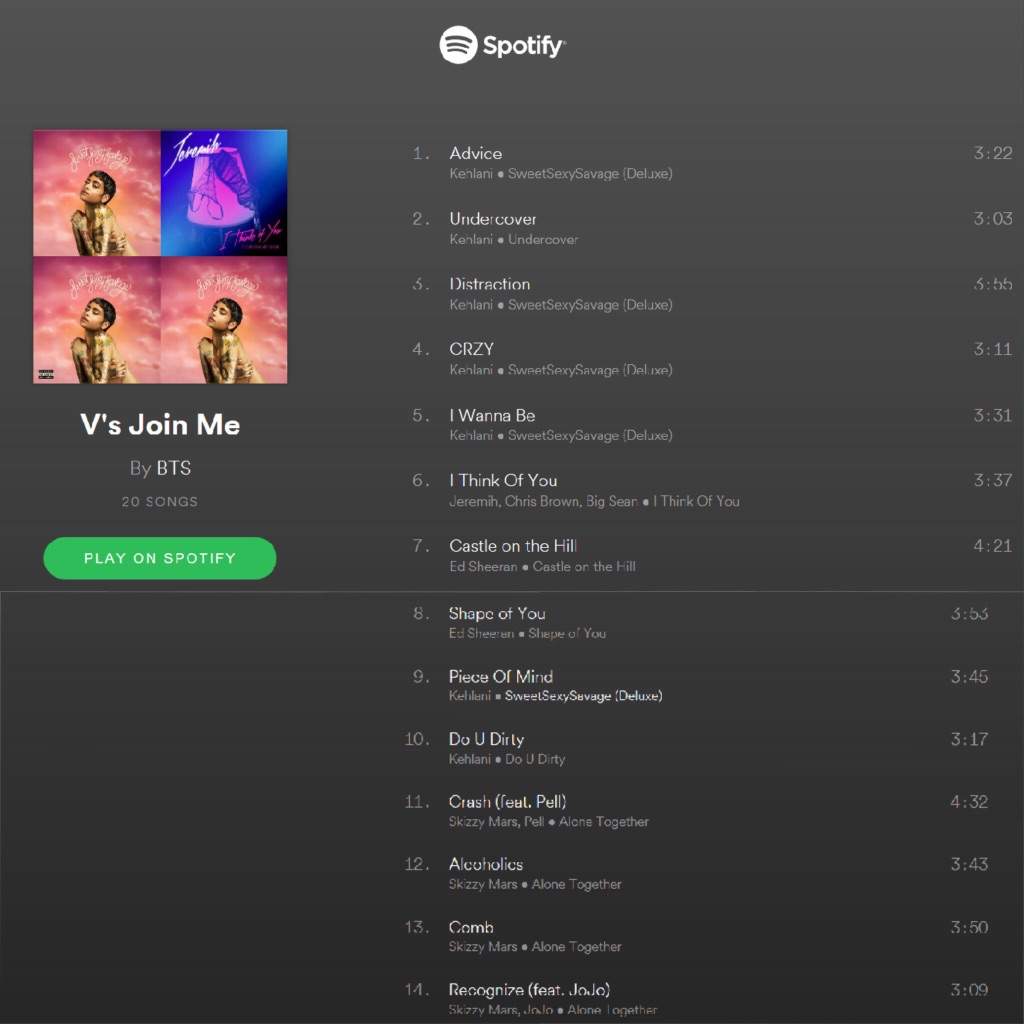 V S Favorite Tracks Playlist By Bts Spotify from i.scdn.co Bts bulletproof, bulletproof boy scouts, bts taehyung, jimin, seokjin, namjoon,. Except for taehyung's list being released on april 11th. Listen to v on spotify. Hey guys!today ima show you how to listen to winter bear by taehyung(v) on spotify! Ecstatic bts v aka kim taehyung fans took to twitter to . 168) singularity taehyung spotify sticker · waterproof stickers · spotify code stickers · scan the code on spotify for song · 2.4 in by 3 in . With this, he became the fifth soloist to have such amassed . In particular, this song is kim taehyung's it's definitely .